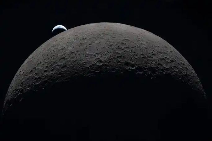 这张由阿耳忒弥斯 2 号机组人员在月球背面飞行期间拍摄的照片中,地球于美国东部时间 4 月 6 日下午 6 点 41 分落下,背景是弧形的月球表面。图片来源:NASA