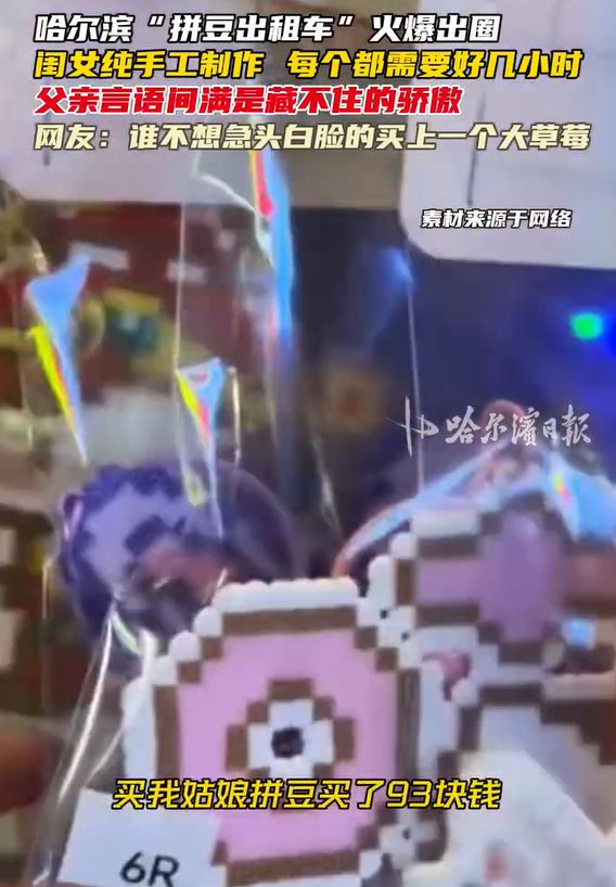 近日,哈尔滨“拼豆出租车”火爆出圈,一位司机大哥在出租车上卖自家女儿纯手工制做的拼豆,没想到竟比自己跑车的收入还高。父亲一脸骄傲的向顾客介绍自己女儿亲手做的拼豆,还说挣来的钱都会转给女儿。游客开玩笑说,“感觉您女儿挣得比你多”,该父亲回应:“有一天我都崩溃了,打车车费才10元,买我姑娘拼豆93块钱。”